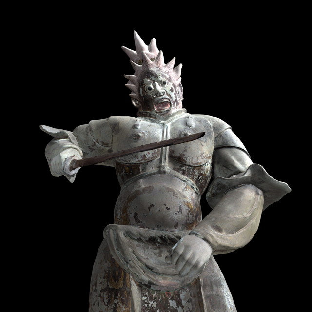 これらの像は角材と木片を組み合わせた心木に荒縄を巻き、三層の塑土で形成され、表面には白土地・金箔地に彩色が施されている。黒目の部分にはまるいガラス玉を嵌入している。肉身部は朱や緑青で彩色され、目や唇、ひげも精巧に描かれる。甲や兜には金箔地が使われ、唐草文や湧雲文が墨描きや彩色で表現される。火炎唐草文が特に珍しい装飾である。