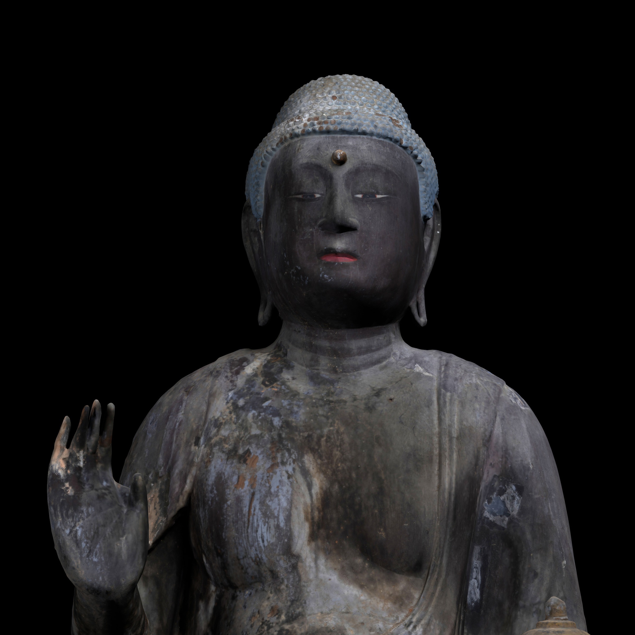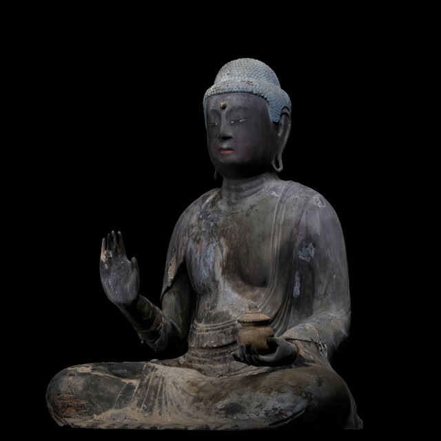 大きな目や、丸みを帯びた独特の顔立ち、圧倒的な体軀が造形力を示す。左手に薬壼を持つ姿や、光背に配置された六体の化仏を含む「一尊七仏薬師」の形式は、『薬師瑠璃光七仏本願功徳経』と『陀羅尼集経』の教義を融合させたものである。本堂の円形土壇も『陀羅尼集経』に基づくとされる。造立年代には諸説あり、天平宝字六年(762)頃や延暦年間(793頃)、800年前後から弘仁期前半(810年代)頃にかけての時期とする説がある 。造東大寺司のような官営工房の存在が背景に推定され、平安初期彫刻へと影響を与えた重要な作品と評価される。